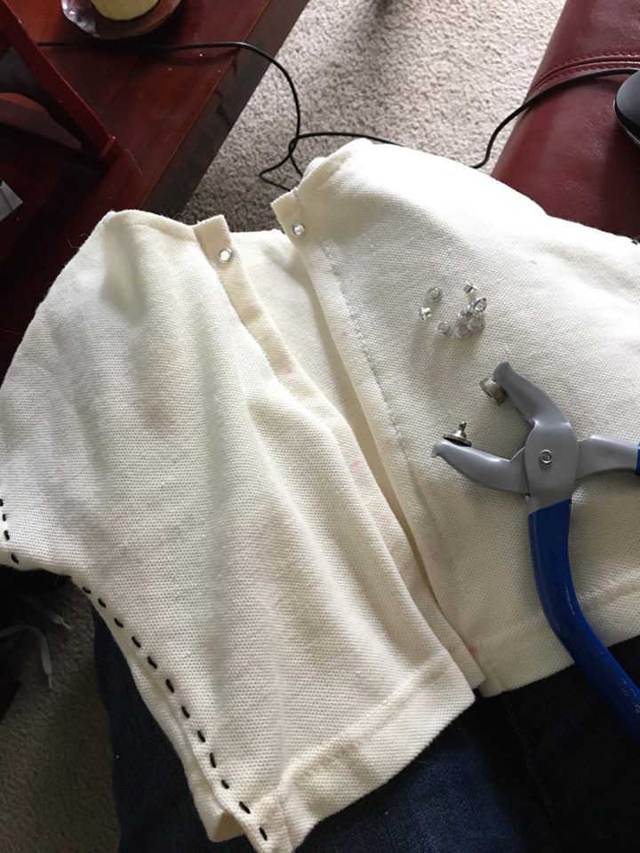 I made the shirt from a child's polo shirt that I got at Goodwill. I ended up cutting it up and sewing a shirt from it. The black detail stitching is done with embroidery thread. The back ties up with closing panel made out of the collar of the polo shirt. I even added little eyelets for the cording to thread through.
